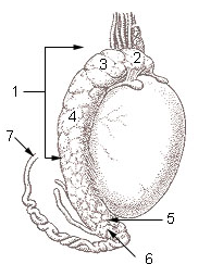 Hình 3: Giải phẫu mào tinh, thừng tinh (1: Epididymis, 2: Head of epididymis, 3: Lobules of epididymis, 4: Body of epididymis, 5: Tail of epididymis, 6: Duct of epididymis, 7: Deferent duct (ductus deferens or vas deferens)