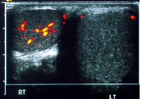 - Cận lâm sàng: Siêu âm Doppler màu cho thấy dòng chảy động mạch hay ghi hình lưu lượng máu ở tinh hoàn bằng đồng vị phóng xạ Tc99m pertechnetache cho kết quả chính xác khoảng 90% [2],[3],[11]. Hai phương pháp này đều dựa trên nguyên tắc dòng chảy của động mạch tinh hoàn, sẽ giảm trong trường hợp xoắn thừng tinh và sẽ tăng trong trường hợp viêm. Tuy nhiên không có phương pháp nào cho kết quả chắc chắn và chẩn đoán phải dựa trên khai thác bệnh sử và khám lâm sàng tỉ mỉ [3].