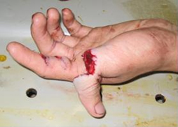 - Ngón II tay trái: vết thương rách nát mặt gan đốt gần và gây đứt gân gấp sâu và nông (Hình).